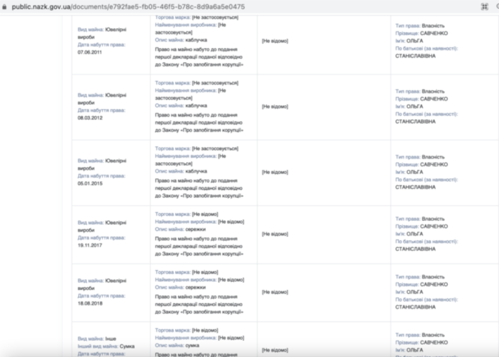 Також, вона задекларувала п’ять ювелірних виробів, три сумки, квартиру в Києві та будинок у селі Гора Бориспільского району Київської області.