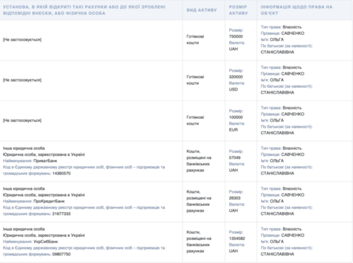 Крім того, нардепка Савченко у 2019 році отримала понад 1,5 млн грн заробітної плати, а на банківських рахунках має 1,47 млн грн. Також Ольга Савченко зберігає готівкові кошти – їх у неї назбиралося 750 тисяч грн, 320 тисяч доларів та 100 тисяч євро.