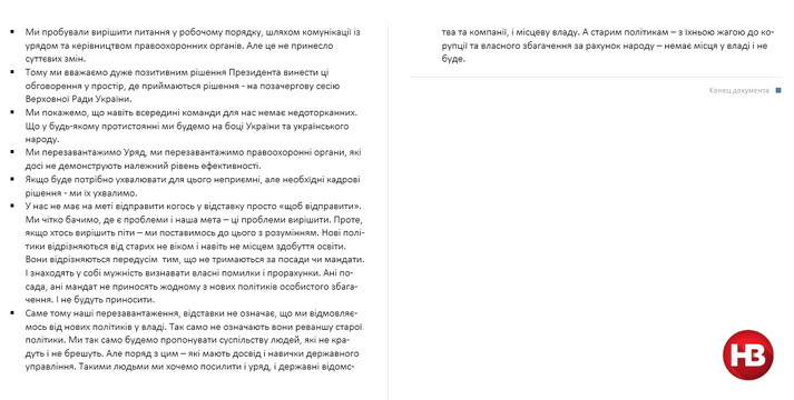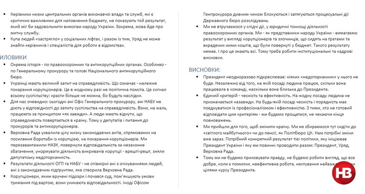 «Президент неодноразово підкреслював: ніяких недоторканних у нього не буде. Незалежно від того, на якій посаді людина працює, скільки вона працювала в команді, наскільки вона близька до президента. Єдиний критерій – чесність та ефективність. На одну посаду людина не призначається назавжди. На будь-якій посаді чесність і порядність має поєднуватися з професіоналізмом і ефективністю. з тими, хто не готовий відповідати цим критеріям – ми будемо прощатися, не чекаючи кінця повноважень», – наголошується в документі.