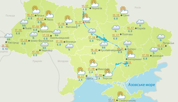 За прогнозами українських синоптиків, на сході України сьогодні очікуються дощі, температура повітря вдень становитиме від +15 до +19. У центральних регіонах України також дощі, денна температура від +15 до +21.