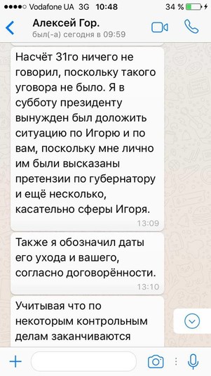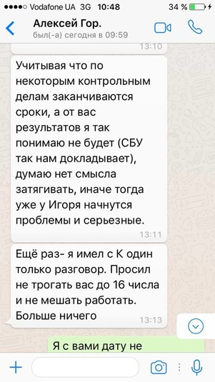 «З огляду на, що по деяких контрольних справах закінчуються строки, а від вас результатів, я так розумію, не буде (СБУ так нам доповідає), думаю, нема рації затягувати, інакше тоді вже й в Ігоря (Ткаченка) почнуться проблеми й серйозні», - написав Горащенко відповідно до листування.