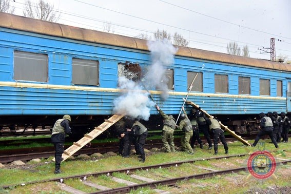 «Усередині вагона група молодих людей утримувала правоохоронців і частину пасажирів. Кожен з них міг бути мішенню у разі, якщо вимоги зловмисників не буде виконано. На місце події прибув спецназ. Особовий склад розбився на кілька штурмових груп і зайняв позиції для атаки. Звільнення відбувалося за двома напрямками: одна група потрапила всередину через двері, одночасно друга - розбила два вікна вагона. Жертв серед заручників немає», - коментують підсумки навчання у Нацполіції.