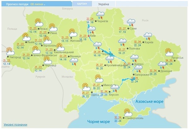 У середу, 8 липня, грозовий фронт переміститься на схід країни, де спека спаде до 29-31 градуса. У центральних областях також очікуються грози та 22-27 градусів. У західному регіоні очікується мінлива хмарність, без опадів, 21-24 градуси.