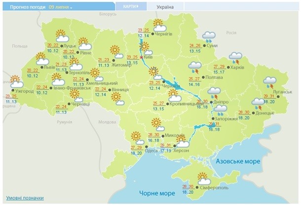 У четвер, 9 липня, невеликі грозові дощі очікуються лише на сході України, де температура буде утримуватися в межах 28-31 градусу. Найпрохолодніше, як і раніше, буде в західних областях 20-24 градуси. У центрі країни 22-27 градусів, без опадів.