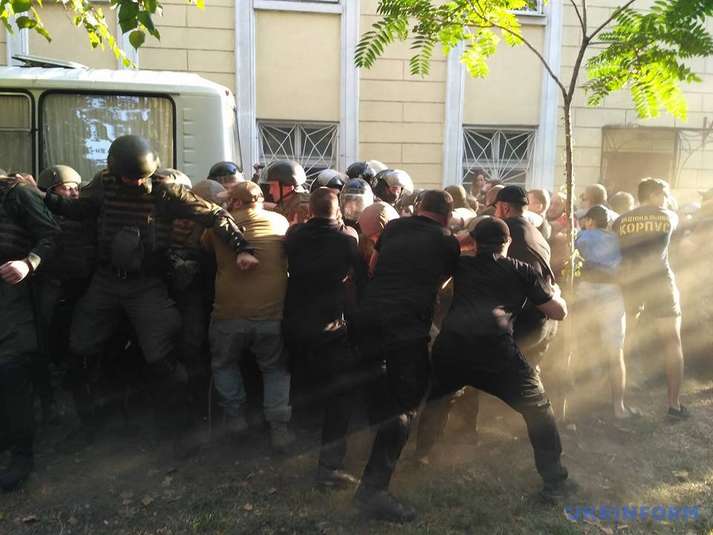 «Періодично виникають сутички з правоохоронцями, які охороняють суд. Поліція змушена застосовувати сльозогінний газ. Активісти відступають, приходять до тями після газу і роблять спроби атак знову», - зазначає видання.