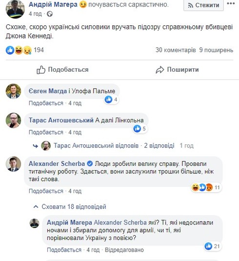 «І Улофа Пальме (прем'єрміністра Швеції Улофа Пальме було вбито 28 лютого 1986 року на центральній вулиці Стокгольма, - ред.)», «А далі Лінкольна (16-го президента США застрелили у театрі у 1865 році)», - підтримали «версію» Магери його підписники.