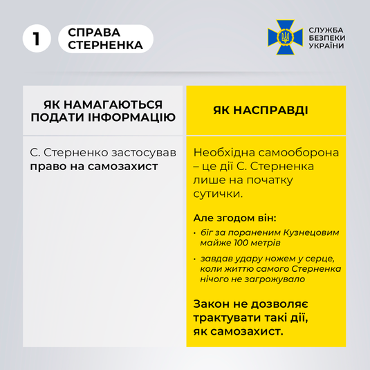 Також сумнівно виглядають слова С.Стерненка, що він завдав смертельних поранень ножем, який нібито відібрав у І.Кузнецова та О.Ісайкула. Сергій особисто підтвердив приналежність йому ножа під час власної онлайн трансляції у мережі Facebook з місця події», - розповіли в СБУ.