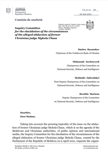 «Беручи до уваги нагальну актуальність питання про викрадення колишнього українського судді Миколи Чауса, яке є на порядку денному влади Молдови та України, громадської думки та міжнародних ЗМІ, слідча комісія для з’ясування обставин викрадення колишнього українського судді Миколи Чауса, створена в парламенті Молдови 9 квітня 2021 року, звертається із запитом щодо організації в період із 28 по 31 травня зустрічі, включно з онлайн-режимом, у двосторонньому міжпарламентському молдовсько-українському форматі», – йдеться в листі.