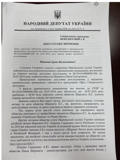Народні депутати з фракції «Європейська солідарність» звернулися до генерального прокурора з вимогою змінити підслідність справи про вбивство журналіста Павла Шеремета. На їхню думку, розслідуванням має займатись не МВС, а СБУ.