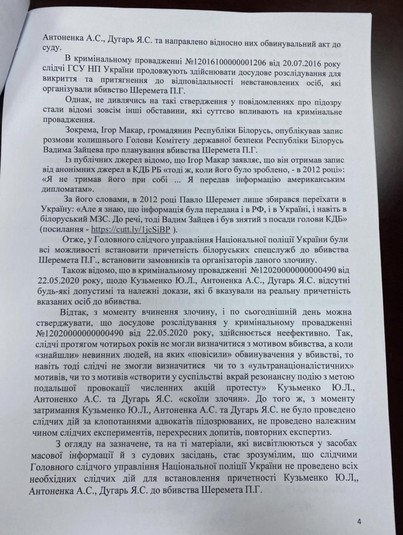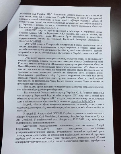 «Ми звертаємось до генерального прокурора Венедіктової з вимогою змінити підслідність по справі Шеремета, де троє обвинувачених Андрій Антоненко Юлія Кузьменко і Яна Дугарь мають різні запобіжні заходи. Яна має можливість спокійно пересуватися по території України. Юлія Кузьменко під цілодобовим домашнім арештом. І Андрій уже більше року в СІЗО», – говорить Михайло Бондар.