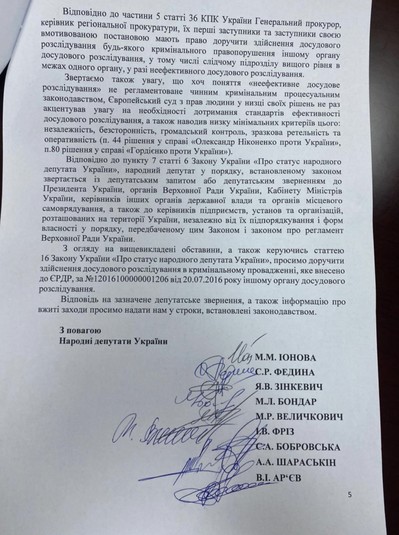 Депутатське звернення підписали народні депутати з фракції «Європейська солідарность» Марія Іонова, Софія Федина, Ірина Фріз, Яна Зінкевич, Михайло Бондар, Микола Величкович, Володимир Ар’єв, а також Соломія Бобровська та Андрій Шараськін з фракції «Голос».
