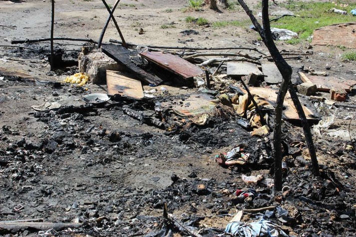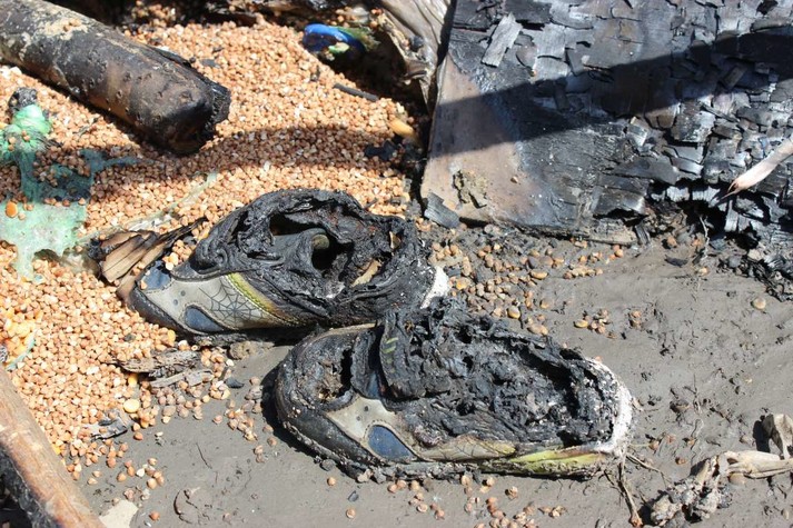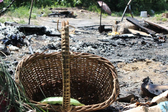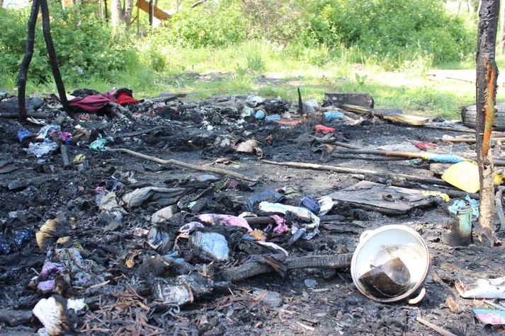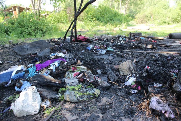 Тепер нікого із мешканців табору на згарищі немає - хто утік посеред ночі після погрому, кого забрала швидка допомога. На місці табору залишилися обвуглені дерев’яні каркаси наметів, металевий посуд, обпалені дитячі іграшки, одяг і навіть ікона.