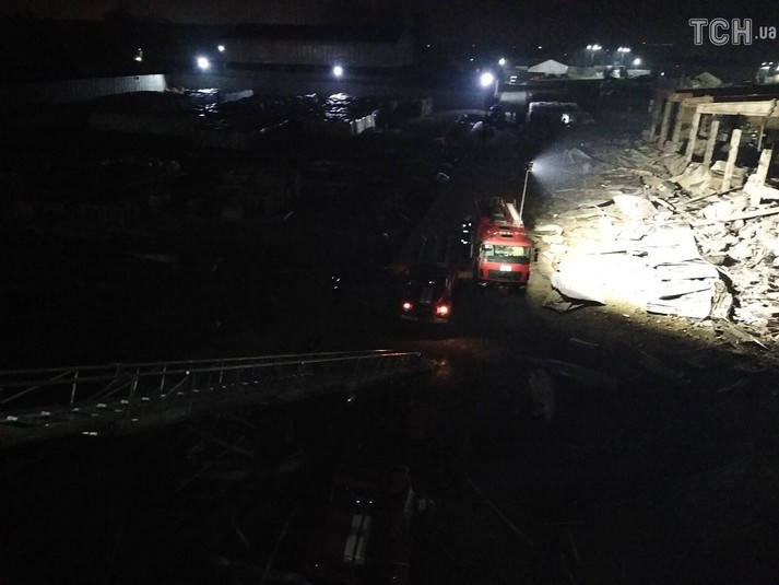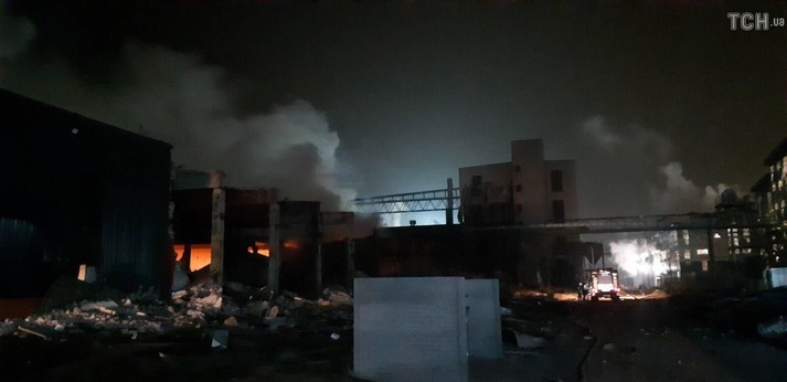 Відразу після вибуху почалася пожежа на складі з сировиною, яку пожежникам довелося гасити з великими труднощами.