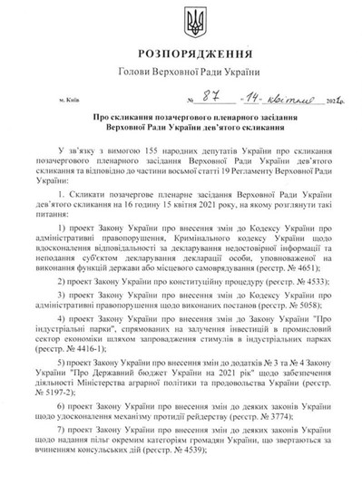 «У зв'язку з вимогою 155 народних депутатів України про скликання позачергового пленарного засідання Верховної Ради України дев'ятого скликання і відповідно до частини восьмої статті 19 Регламенту Верховної Ради України з проханням скликати позачергове пленарне засідання... на 16 годину 15 квітня 2021 року», – ідеться в повідомленні.