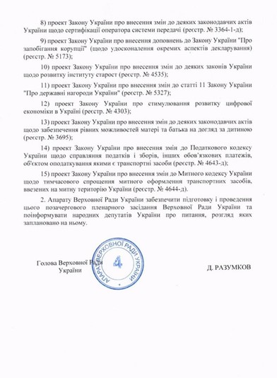 Голова Верховної Ради Дмитро Разумков підписав розпорядження про скликання позачергового засідання на 15 квітня.