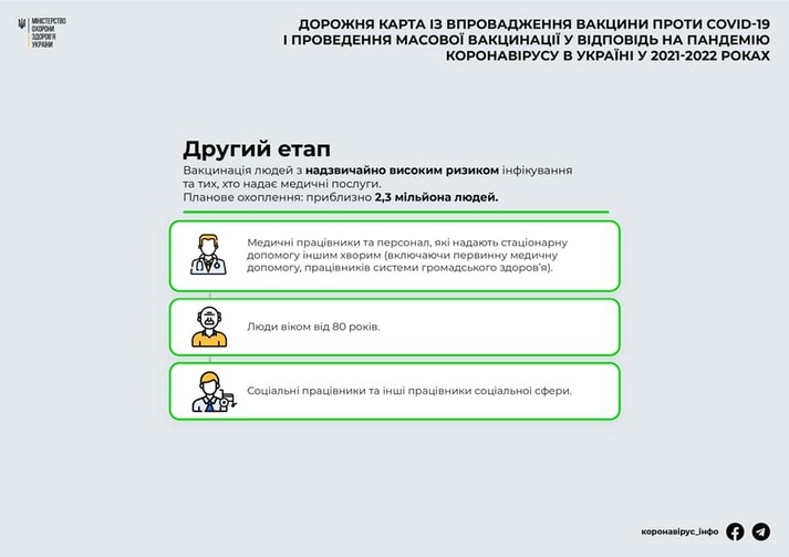 Перший етап охоплюватиме приблизно 355 тисяч людей з критичним ризиком інфікування: медпрацівники та персонал, які надають допомогу хворим на Covid-19, люди і працівники в інтернатних закладах, будинках для літніх людей та військовослужбовці ЗСУ та Нацгвардії, які беруть участь в ООС.