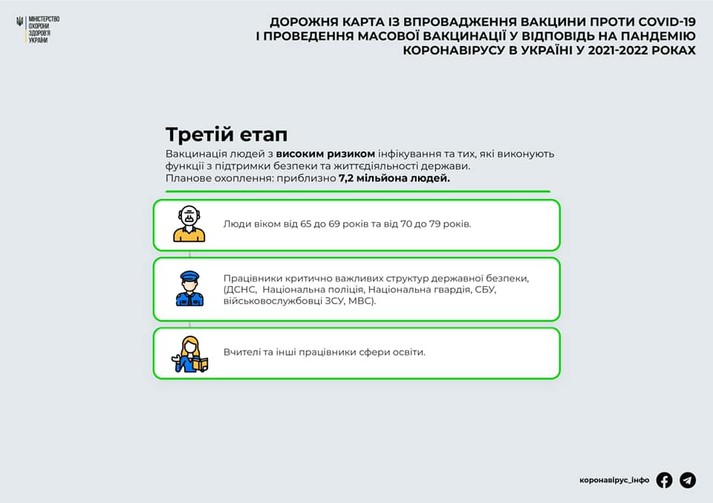 Третій етап вакцинації охопить осіб з високим ризиком захворіти і тих, хто виконує функції з підтримки безпеки і життєдіяльності держави – близько 7,2 млн людей. Це люди віком від 65 до 79 років та працівники критично важливих структур державної безпеки (ДСНС, Нацполіція, Нацгвардія, СБУ, ЗСУ, МВС).