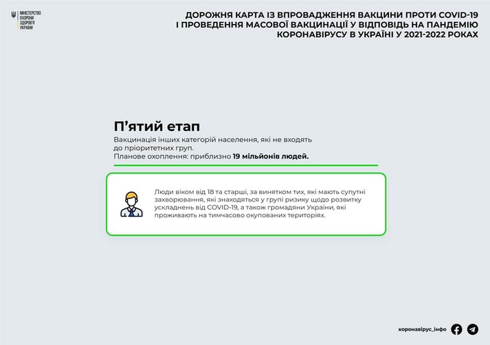 Під час п'ятого етапу передбачено вакцинування інших категорій населення, які не входять до пріоритетних груп. Цей етап охопить близько 19 млн людей.