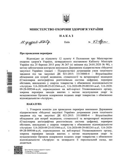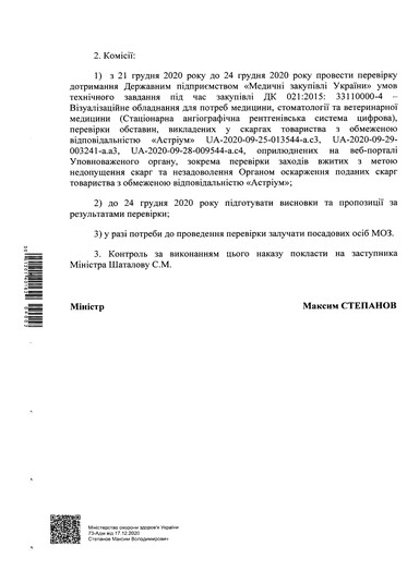 «Це Рахункова палата, Антимонопольний комітет України та центральний орган виконавчої влади, що реалізує державну політику у сфері державного фінансового контролю, тобто - Державна аудиторська служба України. Вони мають право контролювати перебіг процедури у межах своїх повноважень, визначених Конституцією та законами України. Процедура закупівлі ангіографів є призупиненою, і не є завершеною, у розумінні закону. Частина 2 статті 19 Конституції України говорить про те, що органи державної влади та органи місцевого самоврядування, їх посадові особи, зобов'язані діяти лише на підставі, в межах повноважень та у спосіб, що передбачені Конституцією та законами України. Відповідно до положення про МОЗ України, затвердженого постановою Кабміну від 25 березня № 267 (зі змінами), МОЗ не наділено повноваженнями щодо перевірок закупівель. Ця перевірка є нічим іншим, ніж прямим порушенням норм положенням про МОЗ України, законів України та Конституції України», - повідомили у Медзакупівлях.