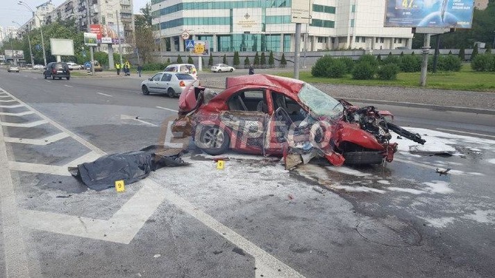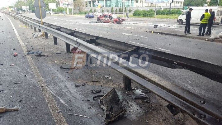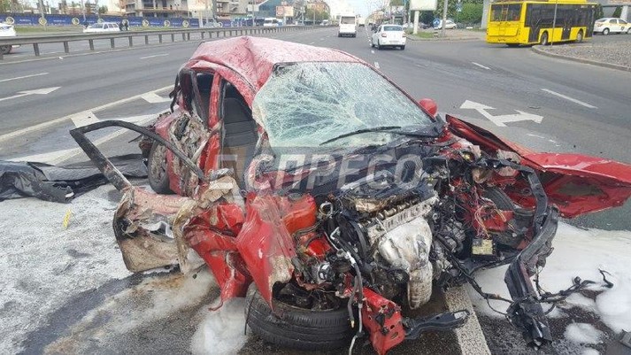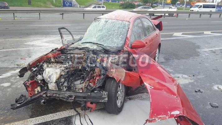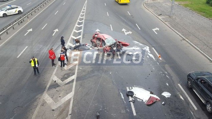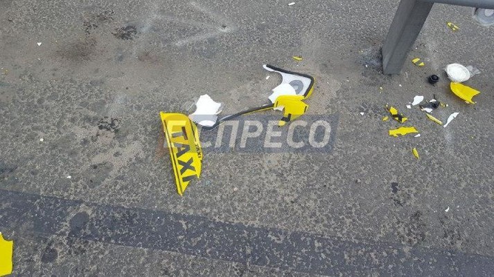 Під Повітрофлотським шляхопроводом у напрямку Шулявської водій таксі Kia Cerato не впорався з керуванням, унаслідок чого автівку занесло і відкинуло у відбійник. Удар був такої сили, що уламки автомобіля розкинуло у радіусі кількох десятків метрів.