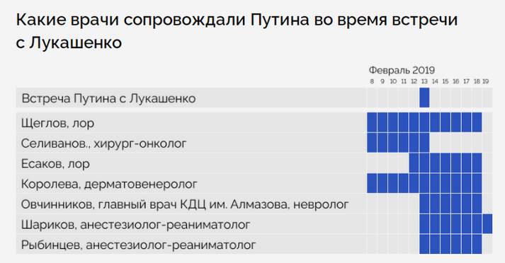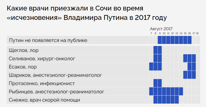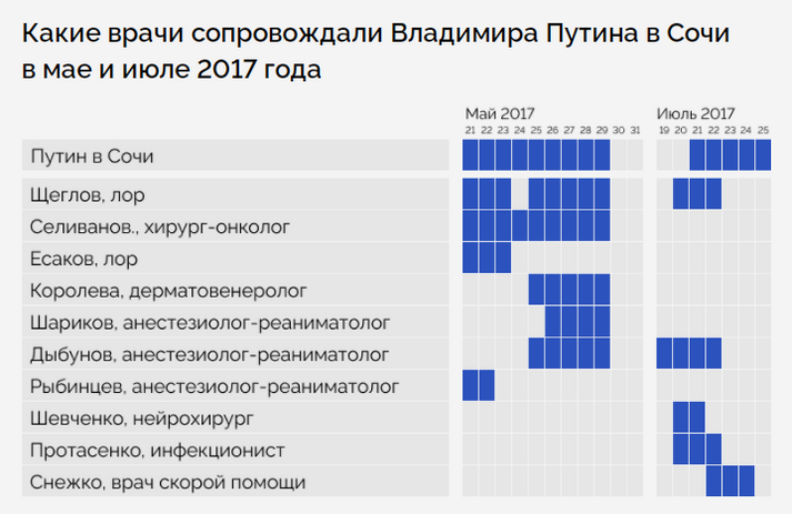 Разом з тим, розслідування показало, що у ті дні, коли Путін «зникав», біля його державної резиденції чи інших об’єктів, де міг перебувати президент Росії, з’являлися нібито у відрядження ті чи інші лікарі. Такі ж «відрядження» повноцінного лікарського пулу відбувалися і під час різних візитів та зустрічей Володимира Путіна.