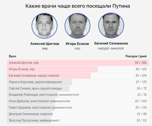 За допомогою сайту держзакупівель розслідувані виявили, які саме лікарі супроводжували хазяїна Кремля в ті чи інші періоди його життя за останні роки.