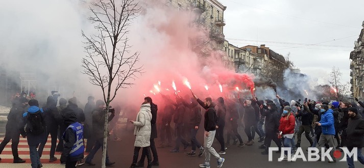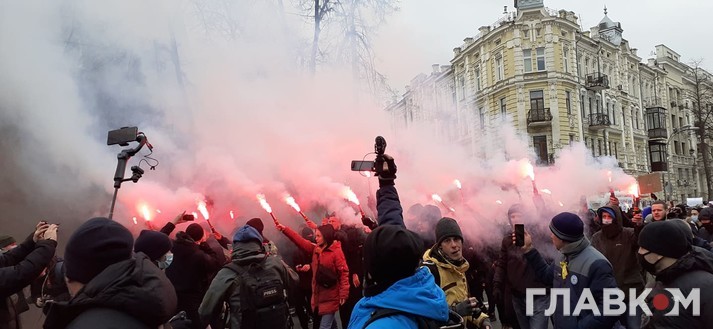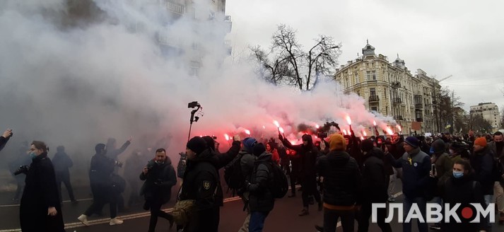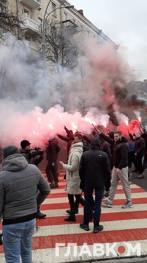 У суботу, 27 лютого, в Києві відбувається акція протесту проти вироку політичному активісту Сергієві Стерненку. Спочатку понад чотири тисячі людей зібралося біля Офісу президента. Згодом протестувальники запалили фаєри та пішли до Офісу генпрокурора, повідомив кореспондент Главкому.