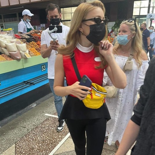 На знімку в Instagram Кароль постала в костюмі від одного з французьких брендів Louis Vuitton. Як повідомляють автори, на ринку співачка купила мед і фрукти.