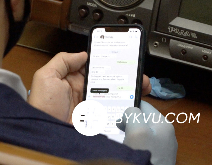 Журналісти відзняли телефон Тищенка, на якому він відправляє адресату Володимиру Зеленському кілька банерів та просить їх подивитися. «Так буде ОК?», – питає Тищенко в президента.