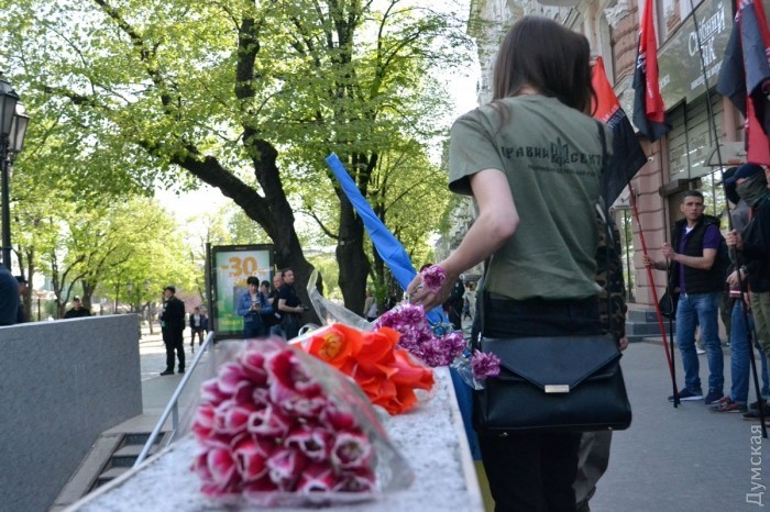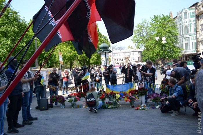 Близько 100 осіб зібралися на перетині вулиць Дерибасівської та Преображенської, де три роки тому сепаратисти застрелили Андрія Бірюкова та Ігоря Іванова, які стали першими жертвами масових заворушень 2 травня 2014 року.