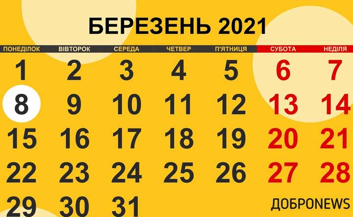 Таким чином загалом у березні в українців буде 9 вихідних днів – 6, 7 і 8 березня; 13 і 14 березня; 20 і 21 березня; 27 і 28 березня. Усі інші 22 дні цього місяця будуть робочими.