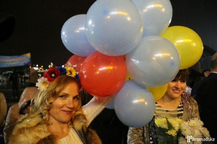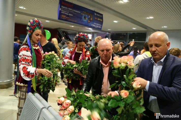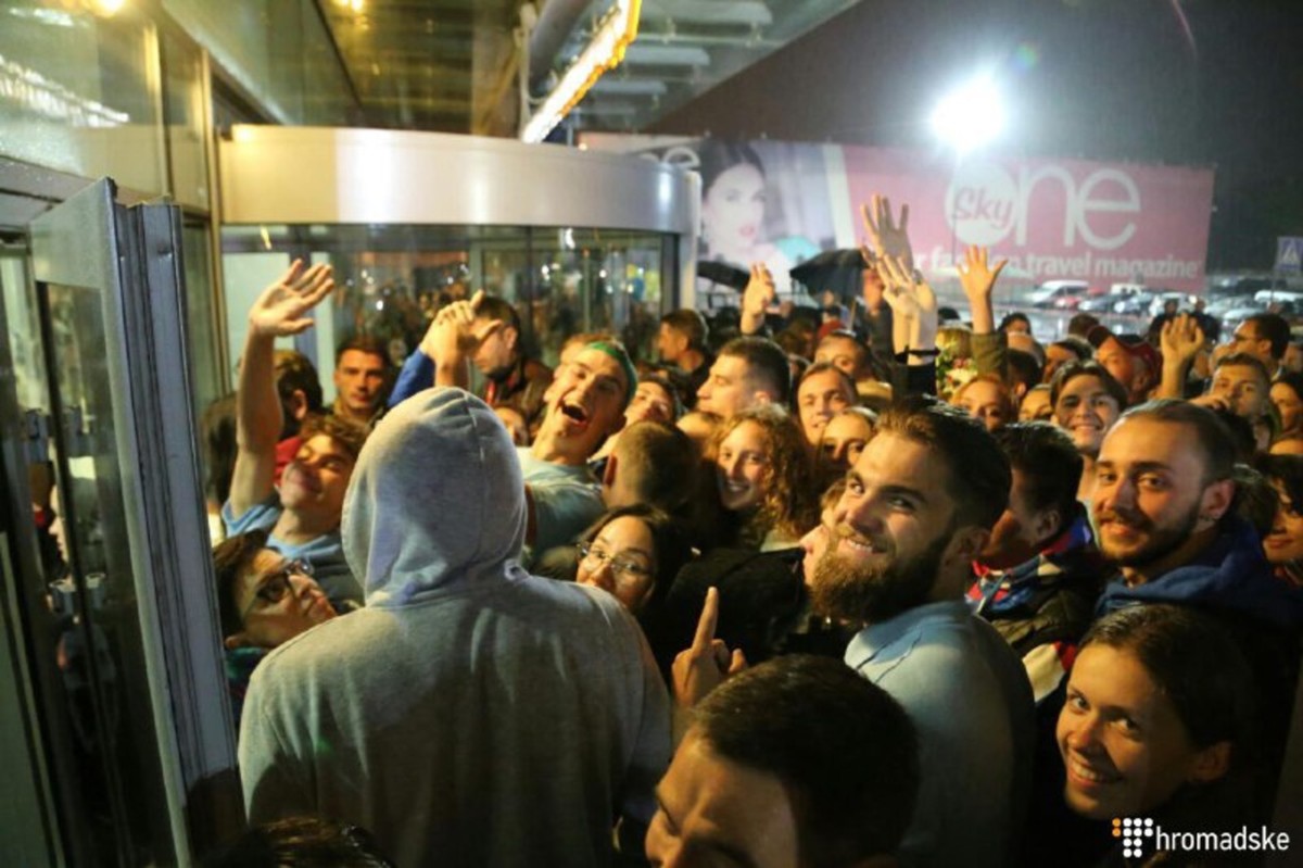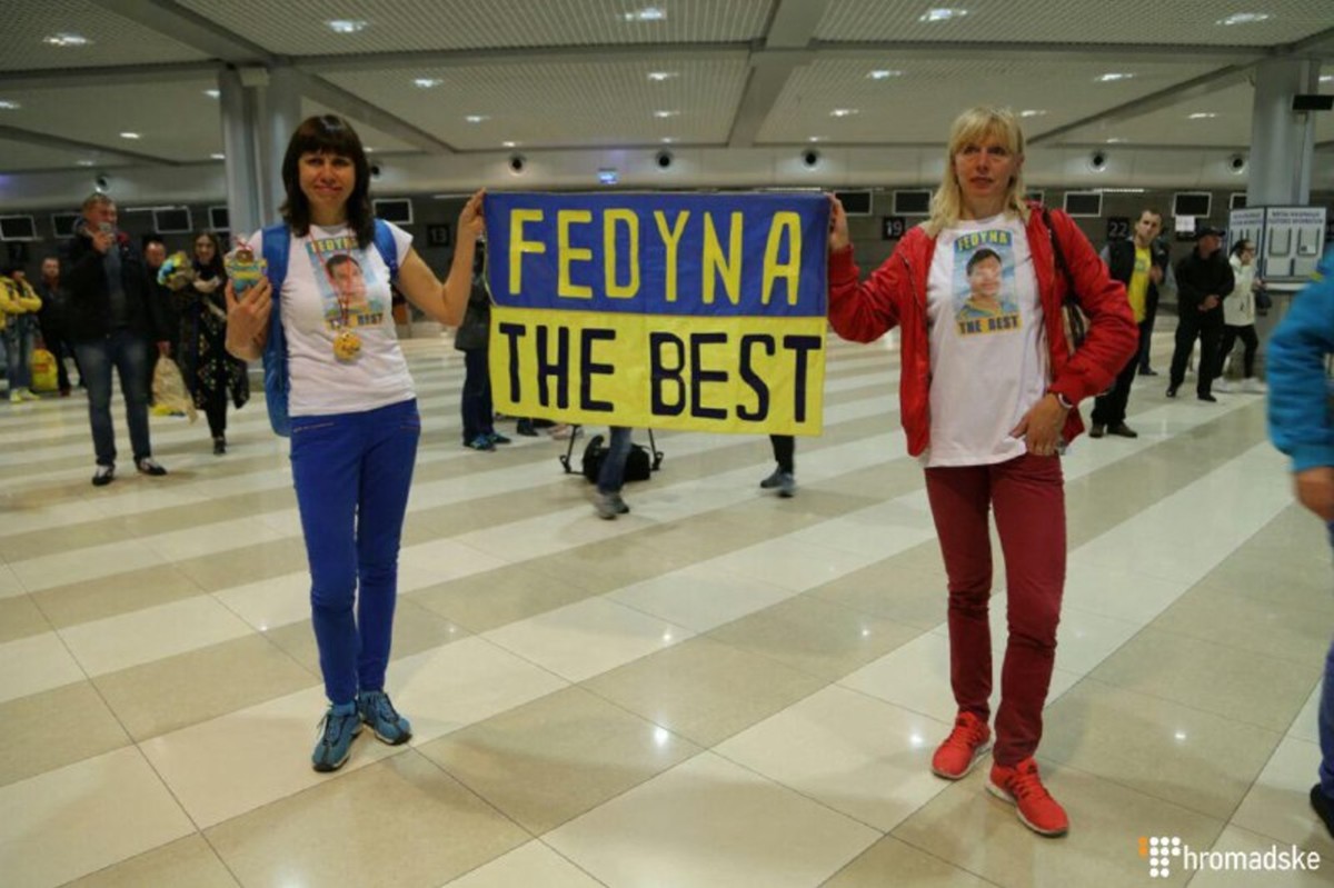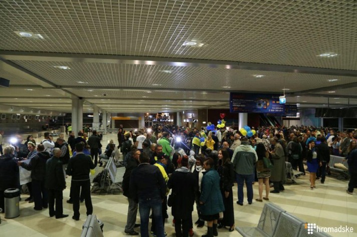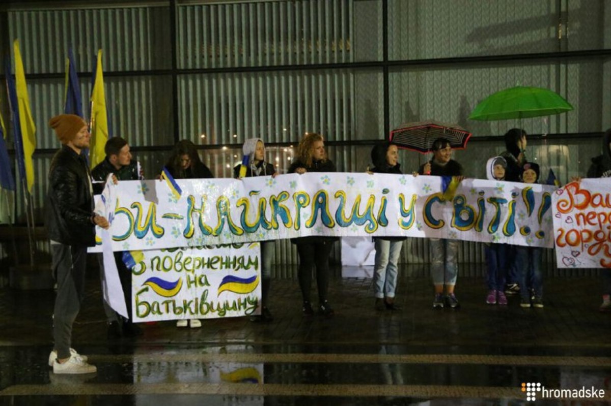Зустрічаючі стояли під стінами аеропорту та в приміщенні терміналу «F» з плакатами у руках, на яких написи: «Ви – найкращі у світі!», «З поверненням на Бітьківщину!» ті іншими. Вболівальники також вигукували різні гасла, в тому числі й «Слава Україні!»