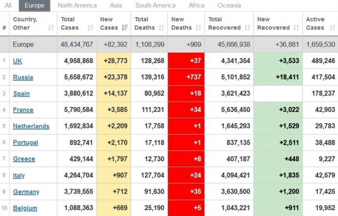За добу 5 липня діагностували понад 430 тисяч нових випадків захворювання на коронавірус. Найбільше хворих додалося у Бразилії, Індії та Індонезії. За даними сайту Worldometers, у Європі за приростом хвороби лідирують Британія, Росія, Іспанія.