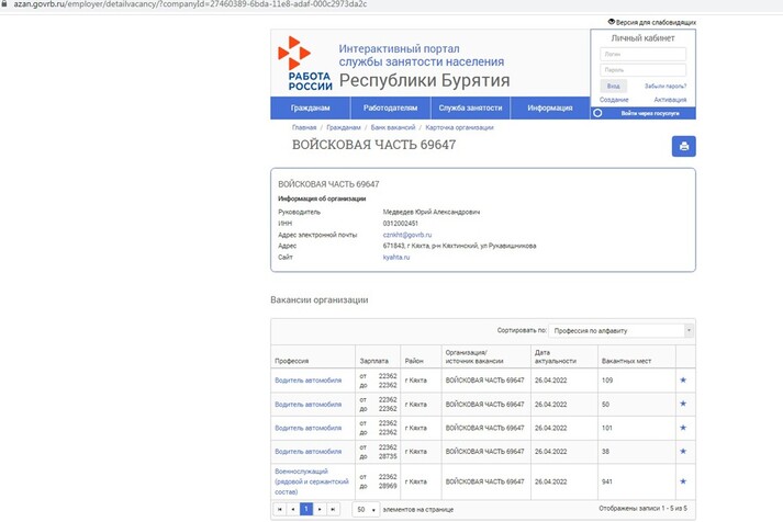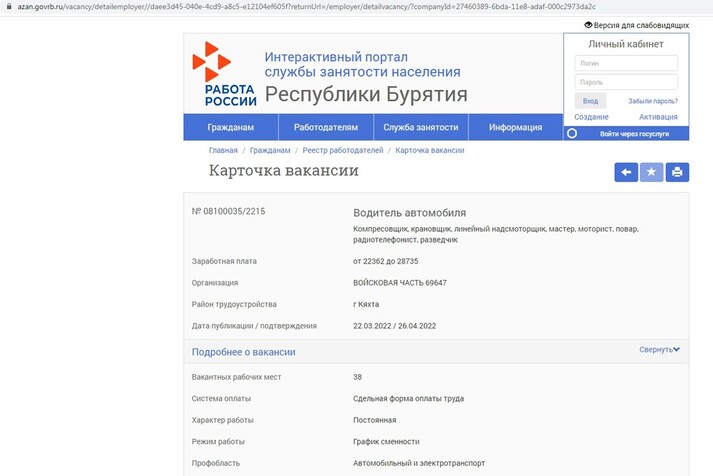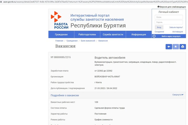 Військова частина №69647, дислокована у бурятському місті Кяхта, опублікувала оголошення про пошук рядових, сержантів та водіїв. Вакансії розміщено на офіційному сайті служби зайнятості республіки. Першим на повідомлення звернули увагу «Люди Байкалу», передає tayga.info.