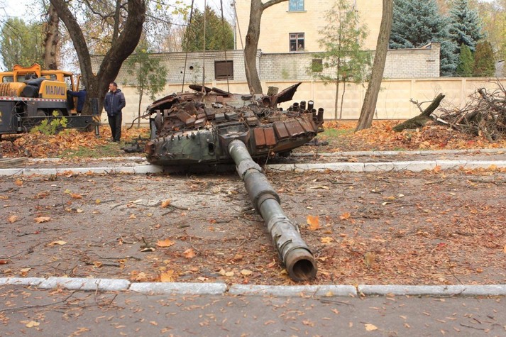У Чернігові біля управління оперативного командування «Північ» Сухопутних військ ЗСУ встановлюють підбитий у бою російський танк Т-72, привезений із зони бойових дій на сході України.