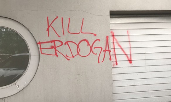 На стоянці перед дипмісією і на стіні сусіднього будинку вандали залишили написи, що закликають до вбивства президента Туреччини Ердогана