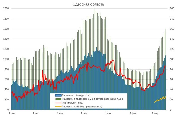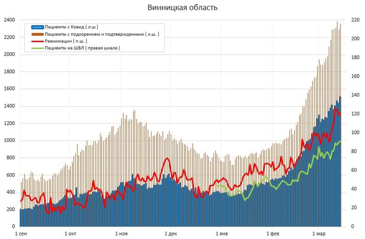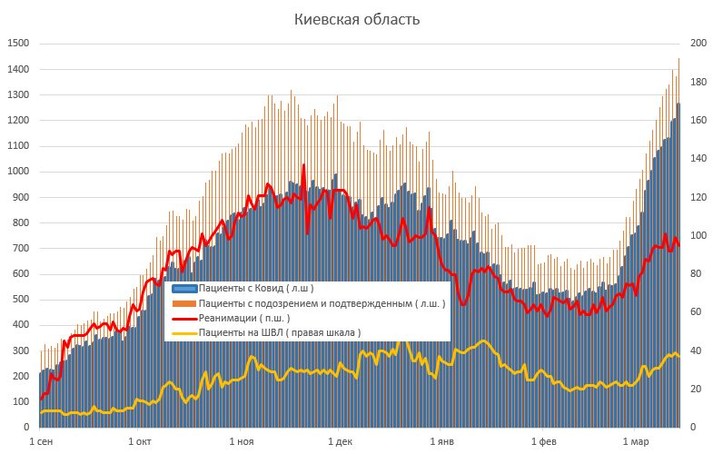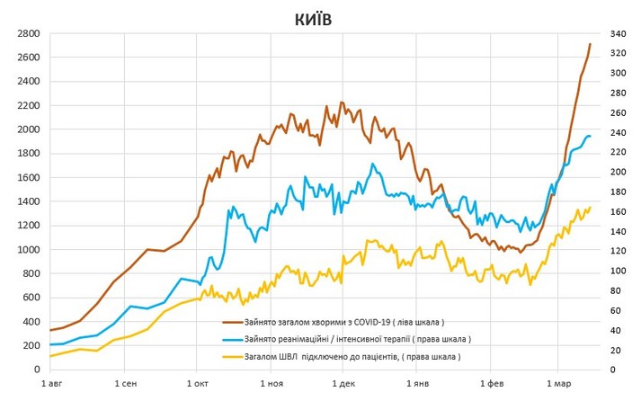 «На загальному графіку, зверніть увагу як Київ йде вертикально вгору. А тепер хочу передати «привіт» київським чиновникам які думають вводити чи не вводити карантин. Ви ж в лікарні №8 або в №3 не хочете йти. Так ось в «Оберезі» та «Добробуті» і Добробуті – місць немає! В Олександрівській лікарні, якщо вірити звіту вже заповнення 90%, а реанімації заповнені усі!!!», – написав експерт.
