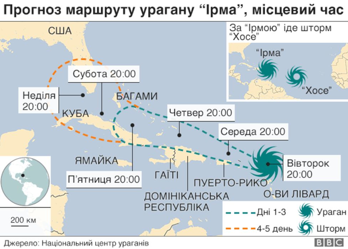 «Ірму» називають найпотужнішим ураганом в Атлантиці за останнє десятиліття. Швидкість вітру в центрі урагану досягає 300 км/год. Ураган досяг п'ятої, максимальної, категорії, - він сильніший за ураган «Харві» який раніше вдарив по узбережжю Техасу і спричинив катастрофічну повінь.