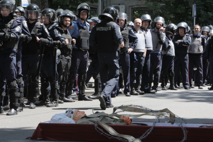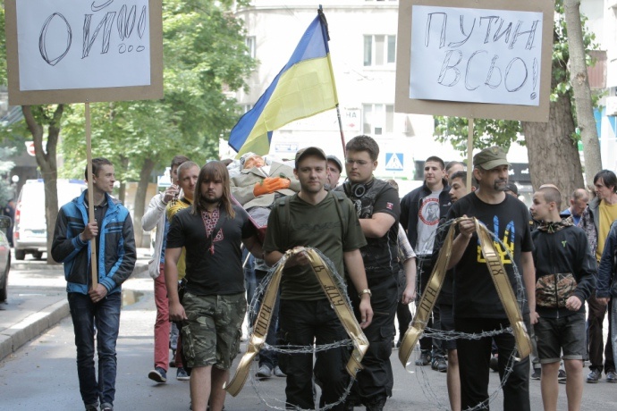 «Два десятки активістів «Правий сектор» пройшли «похоронною» процесією у супроводі духового оркестру до будівлі генконсульства за труною з опудалом Путіна - одягненим у костюм, з мотузяною петлею на шиї замість краватки і дротяним вінцем на лобі з написом: «Горіти тобі в пеклі», - йдеться у повідомленні.