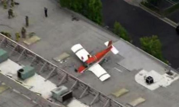 Одномоторний літак Piper PA-28 почав різке зниження при невідомих обставинах, в результаті чого ніс літака пробив отвір в даху будівлі.