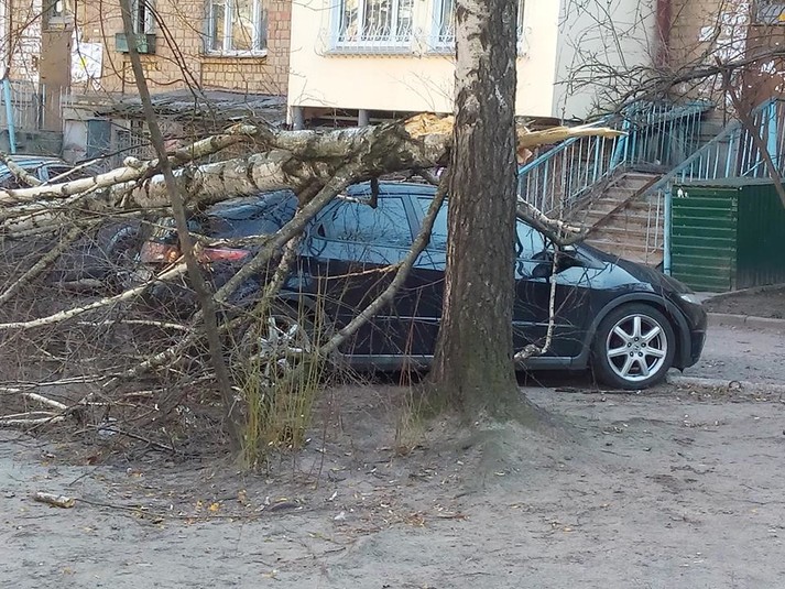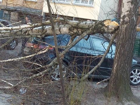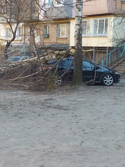 «У 15-ти метрах від дитячого майданчика старе дерево впало прямо на припарковану машину. Потерпілих не бачила. Хіба що машина Київ, вул Краснопільська», - написала вона.