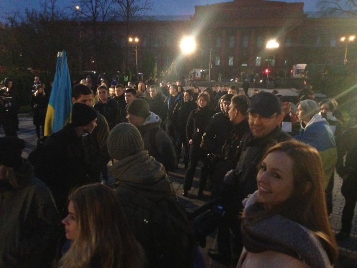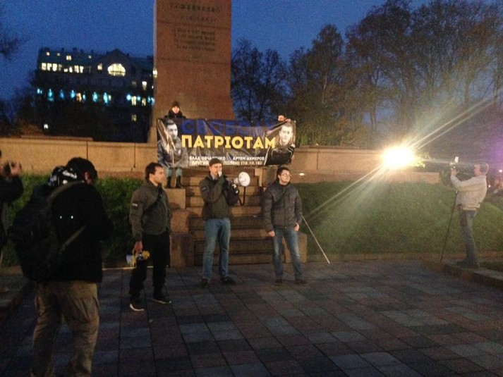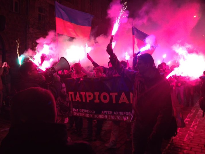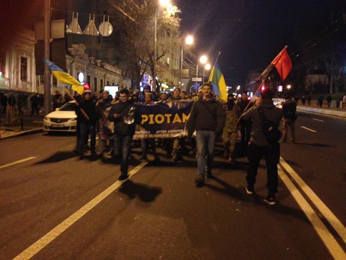 Мітингувальники пройшлись центром Києва. Під час маршу активісти палили файєри. Попереду колони мітингувальники несли банер зі словами «Свободу патріотам».