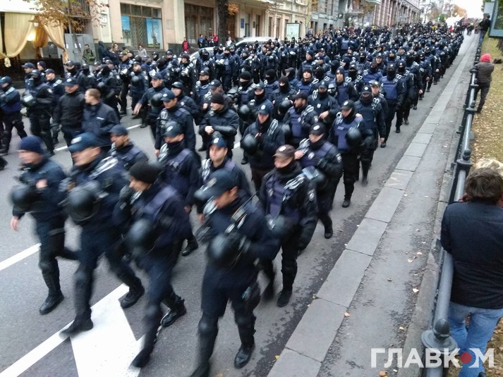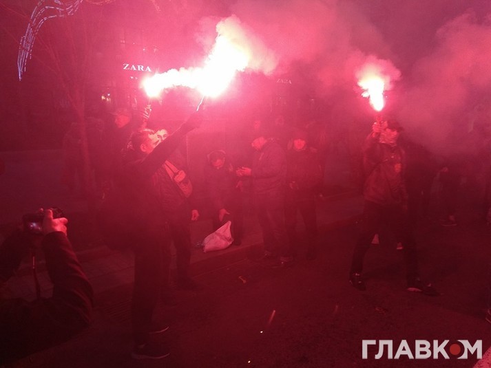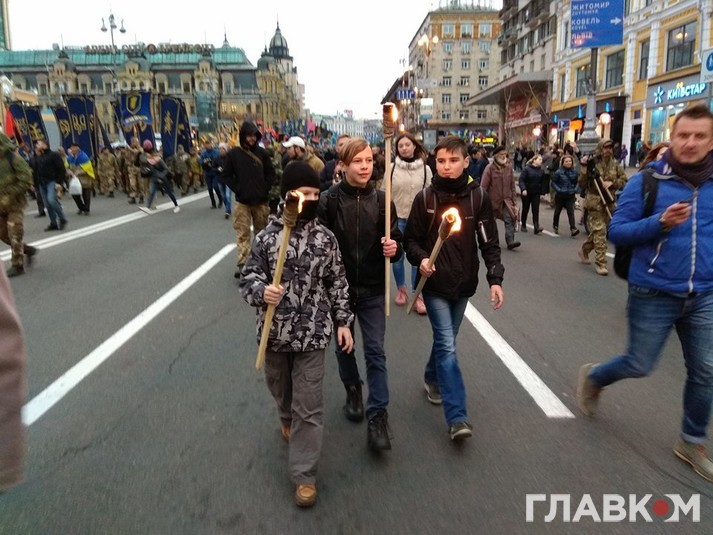 Близько 18 години учасники ходи досягли Хрещатику. Вони скандують «Не відступати, і не здаватись!», «Слава нації» - Смерть ворогам!», «Україна понад усе!», «Один за всіх і всі за одного».