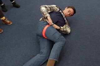 Після короткої теоретичної бази, учасники тренінгу перейшли до практики – накладання турнікетів для зупинки кровотечі на руках та ногах у різних положеннях. У цій справі головне – оперативність, каже тренер. Аби максимально наблизити умови тренінгу до реальних, медійники виконували вправи у бронежилетах та шоломах «Преса» від ЮНЕСКО та МФЖ, наданих прокатним пунктом захисного спорядження Київського Центру журналістської солідарності НСЖУ.