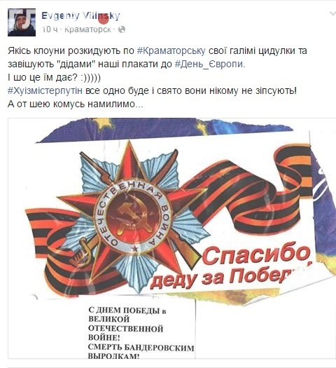 Напередодні святкування Дня Перемоги у Краматорську розклеюють плакати "Спасибі дідові за Перемогу" і розкидають листівки з текстом "З Днем Перемоги у ВВВ" і "Смерть бандерівцям". Про це повідомив перший заступник голови Донецької ВГА Євген Вілінський.