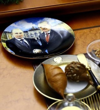 У Кремлі на двосторонній зустрічі президента РФ Володимира Путіна з турецьким президентом Реджепом Тайіпом Ердоганом до ділового обіду подали незвичайні тарілки. На них було нанесено зображення двох президентів і їх рукостискання. Про це повідомило турецьке агентство Anadolu.