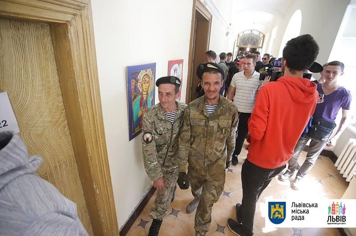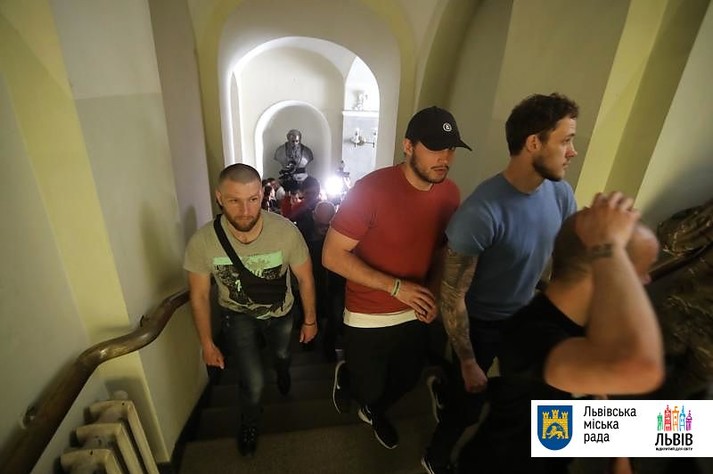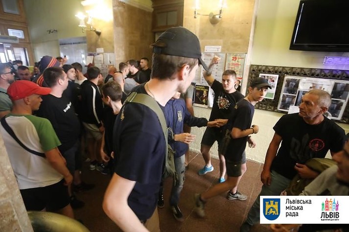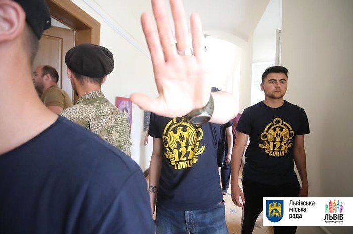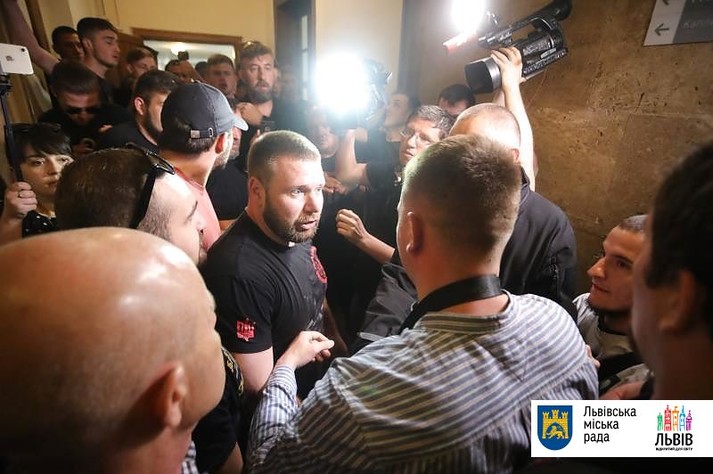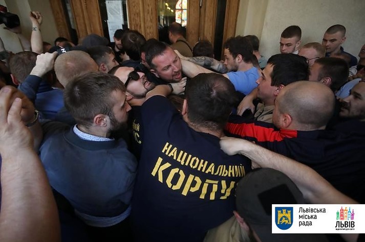 Як повідомляє Zaxid.net, Львівську міську раду штурмом захопила група спортивних молодиків, які назвали себе представниками організацій «Національний корпус», «Розвиток громади» та «Українська спілка учасників АТО», «Сокіл».