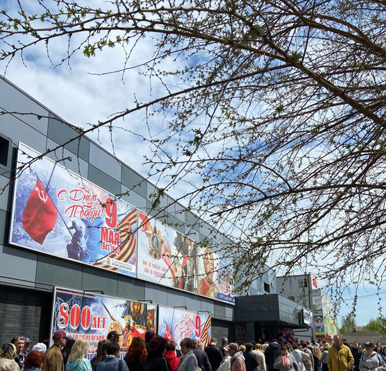 Також на стінах магазину, замість реклами нових товарів, відтепер висять банери, які вітають українців окупованого міста із пропагандистським «святом перемоги».
