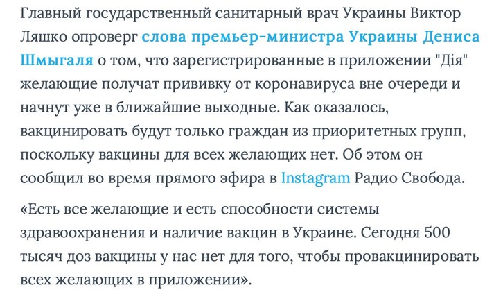 Нагадаємо, Ляшко спростував заяву Шмигаля про вакцинацію всіх зареєстрованих в «Дії». За словами Ляшка, в Україні немає 500 тисяч доз вакцини для щеплення людей, які записалися в чергу на вакцинацію через додаток «Дія».