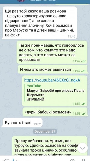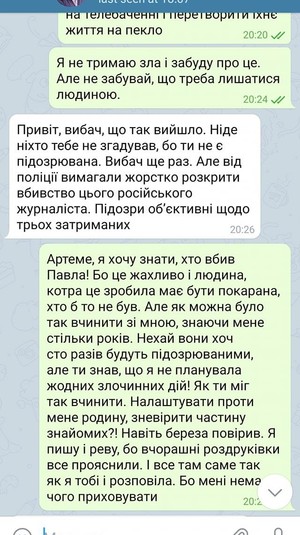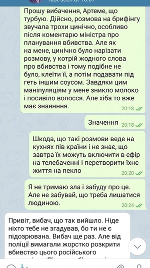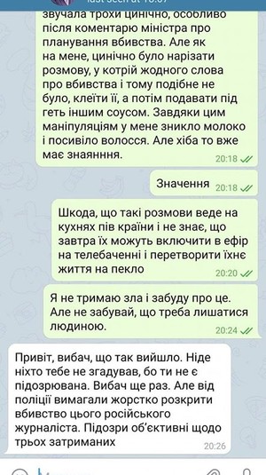 «Особисто спілкувалася з речником МВС. Це наша особиста переписка», — сказала вона, додавши, що листувалася з ним кілька місяців тому, а відповідь щодо Шеремета він нібито написав їй 1 лютого 2020-го.